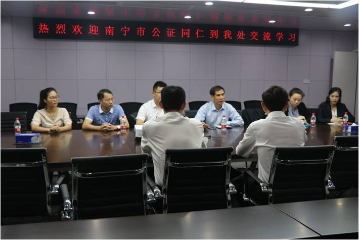 5月13日上午,南宁市公证处副主任黄寿清,公证人员陈文玲、李雨默、郭春霞、李显福,财务人员钟阳昊等一行6人来我处交流学习。我处主任周凡、副主任吴永鸽与南宁市公证处同仁进行了座谈交流。